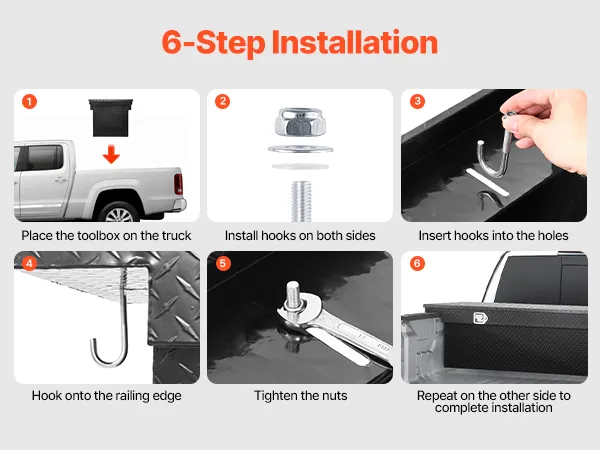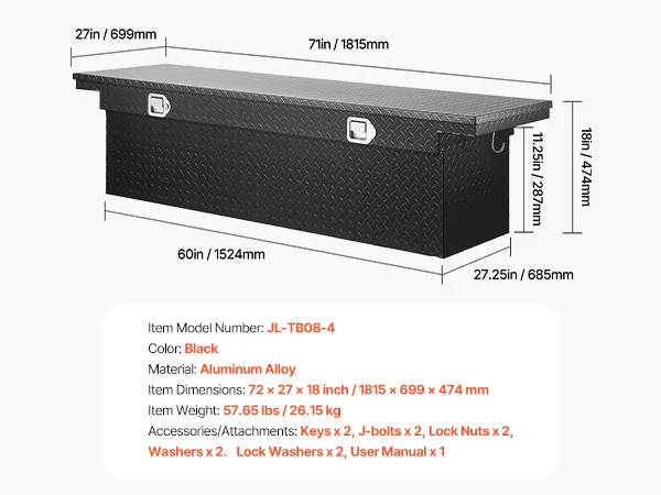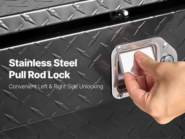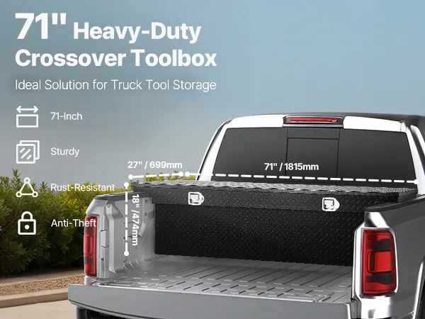 Crossover Truck Tool Box Our 71-inch heavy-duty toolbox is built from thick aluminum, supporting 110 lbs. Its diamond plate surface adds durability, while the weather-resistant design withstands sun, rain, dust, and frost. A stainless steel lock and 100N hydraulic struts ensure secure storage and smooth 70-90° lid opening. Key Features Truck This truck toolbox features a large, open interior, offering ample storage for everyday tools, construction gear, emergency equipment, and accessories. Perfect for various outdoor applications. Trailer Built from high-quality 1.5mm (0.058 inch) thick aluminum, this truck bed box is strong and durable, supporting up to 110 lbs (50 kg). Designed to withstand bumpy roads, it ensures long-term stability and reliable performance. Warehouse Featuring a pull-rod stainless steel lock with a linked mechanism, this underbody toolbox allows for one-side unlocking, making daily access more convenient and efficient. |