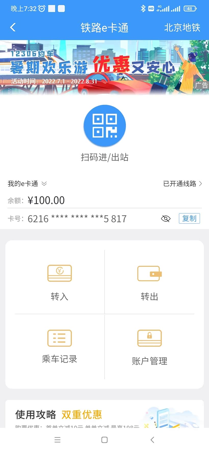 开通铁路e通卡后,返回继续操作,顺利激活。 III充值转入:铁路e通卡需要将申请时绑定的1类储蓄卡资金转入e通卡账户才能使用扣费,下载注册12306铁路app,必须是相同的名字身份证和手机号。登录后找到铁路e通卡,第一次进入我这里提示网络故障,关闭app重新登录12306后,在铁路e通卡界面,已经能看到我之前注册的e通卡账号了。点击转入,直接显示绑定的储蓄卡卡号,填入转账金额和密码,转入充值成功。 最后可以使用粤通卡里的设备检测,来检测etc是否已经完全正常使激活使用了。
