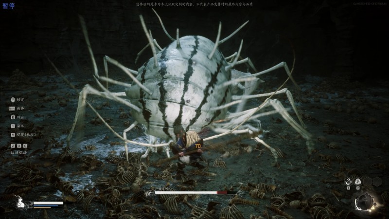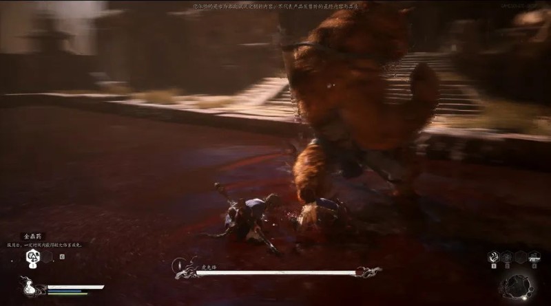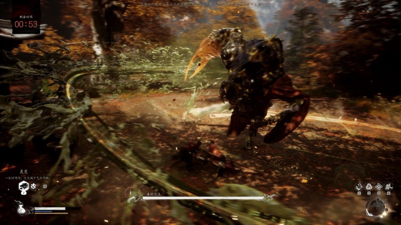 试玩里包含总共6场 BOSS战,其中前三场对应前三个试玩场景,都是硬桥硬马的BOSS对抗,途中几乎没有小怪,难度逐次上升,主要用于让玩家适应游戏里的战斗逻辑和BOSS的挑战难点。 第四个试玩场景才是较为完整的体验,除了基本的战斗系统,这个部分还开放了关卡探索、装备调整,物品采集、小怪战斗等元素,甚至还有支线任务和隐藏BOSS,把叙事和战斗进行了有机结合。 动作系统 我们先来谈谈这款作品最核心的地方——动作。 虽然因为有着数值设定和疑似基于数值的角色成长系统,所以《黑神话 悟空》肯定不是一款纯粹的动作游戏,但只是从玩的部分来说,它就是一款完全基于实时制动作来设计的作品——举个比较容易理解的例子,它不是《鬼泣》,更接近重启后的《战神》。 主角的动作流畅华丽,虽然试玩全程只操作一根伸缩自如的双头棍,却能使出各种或威猛或灵动或霸气的招式,配合着敌人的受创反馈,一招一式都带着强烈的演出感。