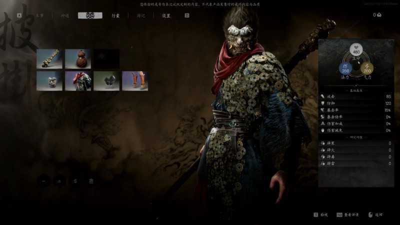 上述三名BOSS的设计体现了游戏支线和隐藏BOSS的设计理念,适合高手直接挑战,也推荐玩家循序渐进逐个攻克,获得的奖励不会直接降低关底战斗的难度,但给予了我们更多的策略选择,核心依然要求玩家磨练技艺。 正式版中,本关的难度可能会降低,一方面,试玩版并没有开放所有系统,菜单中“本事”和“神通”两个项目没有开放,很可能与角色成长有关,所以主角的强度理论上可以更高。 另外一点是,游戏里释放法术需要消耗法力,也就是蓝条。试玩版里没有提供任何恢复途径,而法术本身又是非常强力的辅助手段,正式版流程里可能会在法术流转方面给予更多便利。 系统观感 聊完动作,再谈谈其他同样重要的系统要素。 主角有三个重要属性,分别是生命、法力和耐力,三者都有明确数值,正式版中应该可以通过加点提升,玩家在打破瓶瓶罐罐和击败怪物时都能够获得一种类似魂的货币,应该就是用于强化角色的最常规资源;此外还有攻击、防御、暴击这些非常RPG的数值属性。