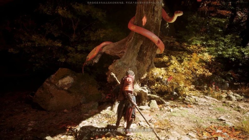 值得一提的是,它甚至会使用“铜臂铁骨”这一主角同款法术,或许在正常流程里,主角是击败它后才学会了这一招。 和赤尻马猴类似,虎先锋在某些玩家的版本里也有二阶段。半血后他会进入“猛虎落地式”,以更加狂野的模式战斗,试玩现场也卡住了一众试玩者。 最后的试玩关卡“紫云山”有1条支线、2个隐藏BOSS和1个关底BOSS。开场我们会遇到一只红色蛇妖,她哭诉自己家园被虫妖占据,夫君身亡,无法收尸,哀求主角击败虫妖。
