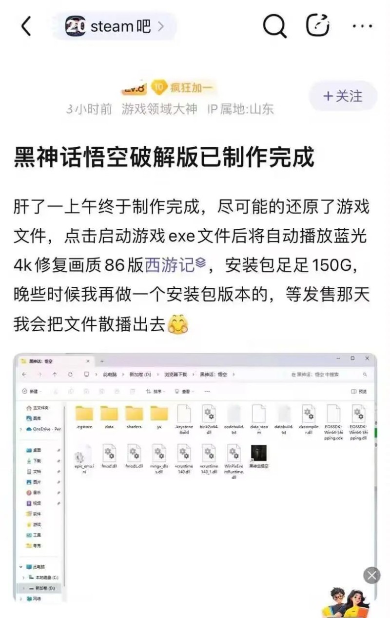 然而这所谓的破解版,只不过是看起来像破解版的玩意,实际上是86版西游记启动器,打开自动播放童年回忆。足足150G的安装包以假乱真,以前只见过《美少女万华镜》新作发售时假包盛行,如今我们国产3A也有自己的烟雾弹了。 楼主把这玩意在发售当天散播出去,如果再加上各大盗版游戏网站的自动爬虫,说不定这真就能“以暴制暴”,让伸手玩家们品尝一回深刻的文化教育(赛博欺诈)。 当然,从目前信息来看,《黑神话悟空》采用了D加密,至少短时间内不会有盗版流出。