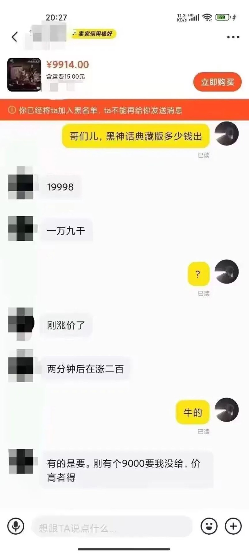 原价1998元的实体收藏版已经在倒钩手里来到了近10倍的溢价,而每两分钟还会再涨两百。 而今天再搜,10倍溢价还是太保守了,价格已经来到了20倍乃至30倍。
