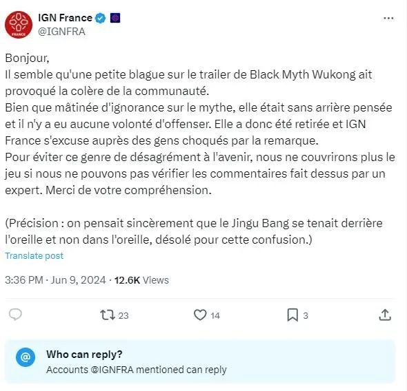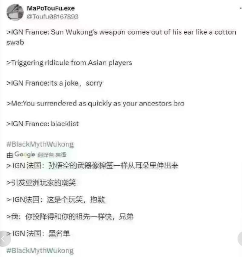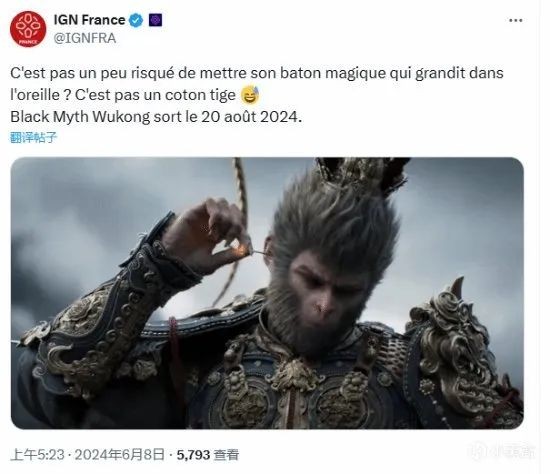 删推的不仅有IGN本部,IGN法国也干了。 不知道IGN法国光辉战绩的可以搜索情报姬文章——“给世界带来更多的美好屁股的韩游《剑星》,让法国人破防了”。IGN法国在发布《黑神话 悟空》发售新闻时提到“把你的可以伸缩的魔法棒放在耳朵里是不是有点危险?这不是棉签”并配以流汗黄豆的表情。