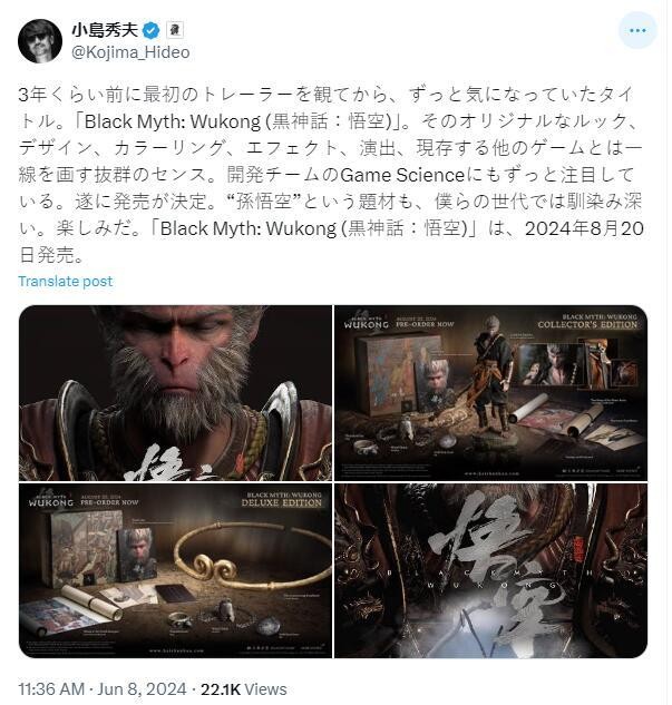 话说回来,知名游戏制作人小岛秀夫也在第一时间出来称赞黑神话,能让岛哥哥用“抜群のセンス(品味拔群)”的游戏可是不多见。 在黑神话开启预购的那一刻,我加的各大游戏社群都沸腾了!沸腾了!群里一整天除了聊黑神话就是黑神话。有畅谈游戏内容的,也有发屌图的,当然最多的就是发预购截图的了,有Steam的有PS的也有部分Wegame的。