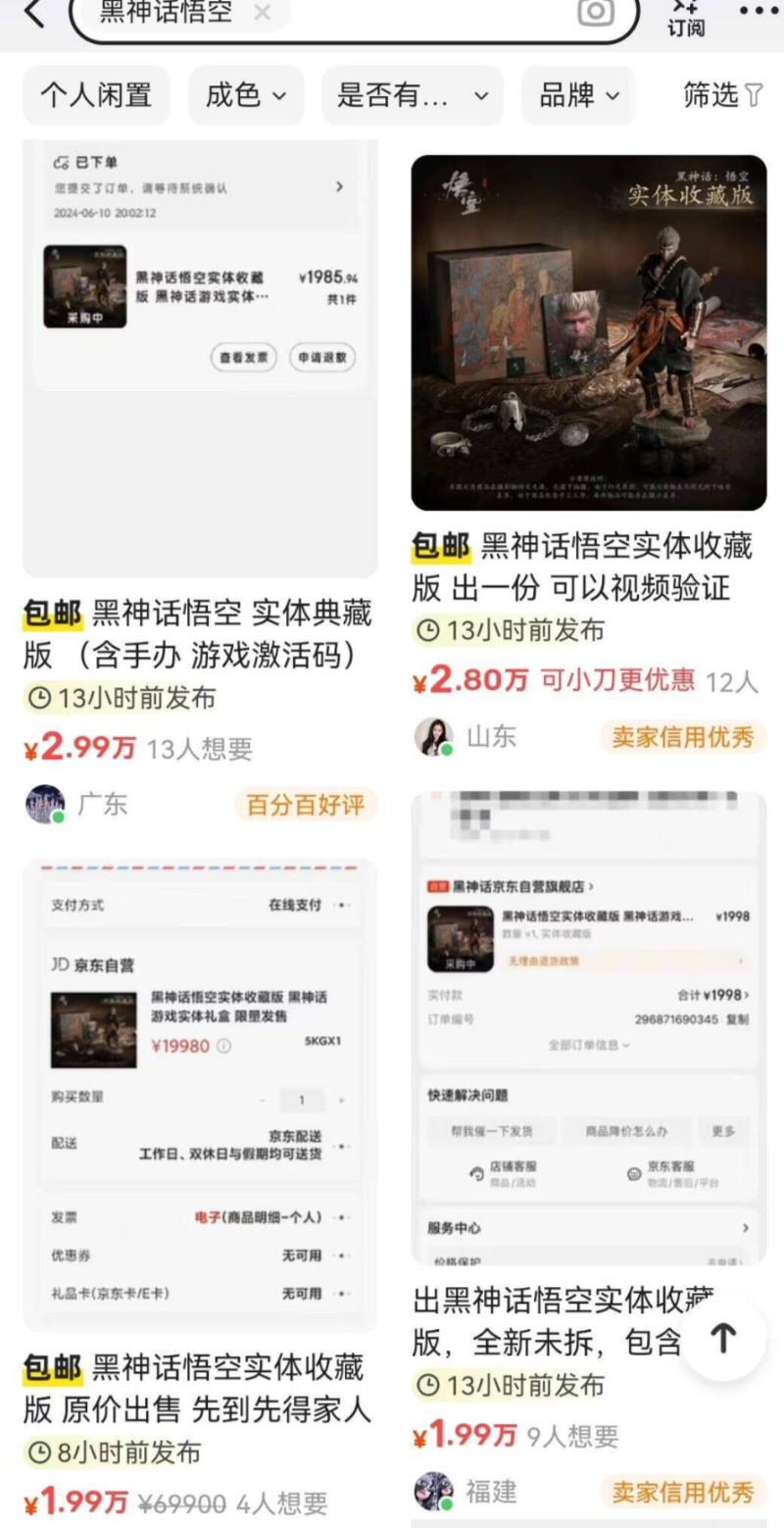 预售开启当天,黑悟空直接冲上了Steam热销榜第一。当天几乎所有的游戏新闻都与黑猴子有关。标准版Steam国区268,PS中国香港地区298,中国区均为全球最低价。 而更夸张的是,同步开启预购的游戏实体收藏版,已经有31.2万人预约抢购,实体豪华版也有19.2万人预约……于是,大伙们能够想象的事情发生了。 倒勾们,赚吐了。