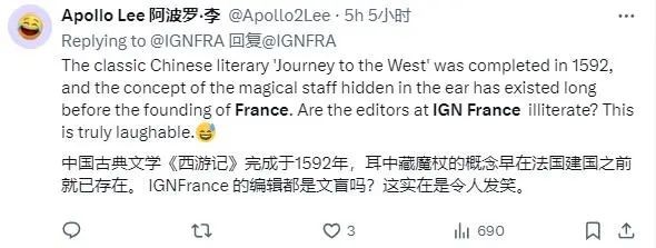 有玩家直接怒怼“中国古典文学《西游记》完成于1592年,耳中藏魔杖的概念早在法国建国之前就已存在。IGN 法国的编辑都是文盲吗?这实在是令人发笑。”还有些比较过激的评论我就不发了,感兴趣的可以上推特看一下,非常精彩。