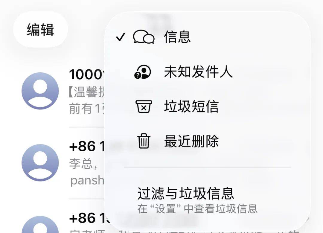 从《IT时报》记者更新系统之后的体验看,解锁手机瞬间确实被视觉变化惊到,突然换成边缘带毛边、图标有立体感的玻璃界面,像换了一款新手机。主屏幕图标采用了更圆润的按钮,似乎都有一层淡淡的玻璃反光,有一种立体的感觉;时间与快捷组件以半透明形态悬浮着,呈现出一种半透明的、精致的玻璃质感;底部的Dock栏和文件夹,也都进化成剔透的形态;通知栏下拉时,背景会泛起水波状的模糊……总之,这股“玻璃感”完全打破了此前iOS 18扁平化界面的单调,在视觉上产生新鲜感。 因为在苹果的设计构想里,UI不该只是浮于玻璃质感表面的独立图层,而是要让玻璃与界面深度融合。 不过,iPhone机型不同,感受到的液态玻璃效果也不同,越新的机型越能接近WWDC发布会上演示的“Solarium”设计原貌。 对于这样的颠覆,有用户觉得像“给手机裹了层果冻”,新鲜又灵动,也有用户表示“用了五年iOS,突然认不出自己的手机了”“设置图标像蒙了层雾,看久了眼睛累”,增加了视觉干扰。 短信 删除需谨慎 在升级完iOS 26之后,《IT时报》记者无意中打开“短信”,想找一条收到过的信息。之前打开“短信”,这条信息就在列表栏里,此时突然找不到了,和“照片”一样,又出现了“肌肉记忆错误”。 照例又研究了一番,原来要点击“短信”页面右上角的“三横线”标识,其把短信分为信息、未知发件人、垃圾短信和最近删除。分类挺细致,《IT时报》记者要找的那条短信由于是某商家发来的,被归在“未知发件人”中。