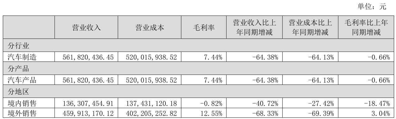 IT之家 8 月 29 日消息,海马汽车股份有限公司 8 月 27 日发布 2024 年半年报显示,公司营业收入约为 5.96 亿元,同比下降 64.55%。亏损约 1.52 亿元,较 2023 年同期的 6364 万元亏损进一步扩大。经营活动产生的现金流量净额 0.19 亿元,同比下降 83.83%。 今年 1~6 月,海马汽车累计销量为 4589 台,同比下降 73.27%。海马汽车在财报中表示,营业收入、现金流量净额的下降均是由于报告期内出口销量的阶段性减少所致。 IT之家注意到,境外销售仍是海马汽车主要的营收来源。2024 年上半年,海马汽车境外营收约 4.60 亿元,占总营收的 77.14%;2023 年上半年,海马汽车境外营收约 14.52 亿元,占总营收的 86.33%。 2024 上半年,海马汽车境外销售的毛利率为 12.55%,同比增长 3.04%。但总体出口销量出现减少,导致境外销售营收同比下降 68.33%。 (责任编辑:) |
