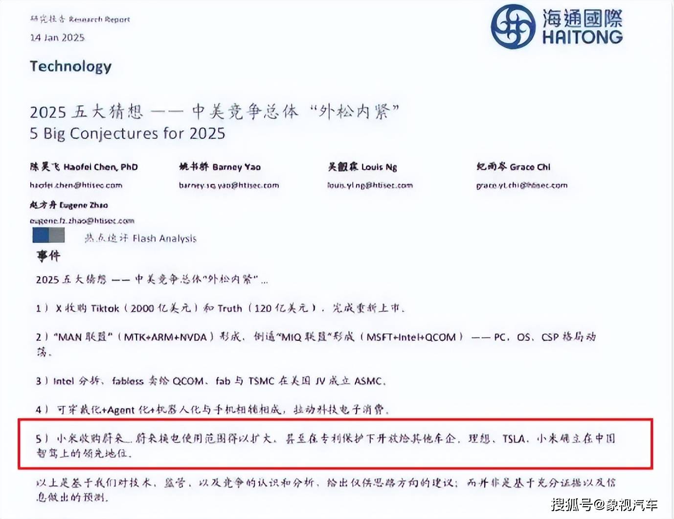 近日,海通国际在一份研究报告中,提出“2025年五大猜想”,其中一个猜想是蔚来今年将被小米收购。这份研报一经发出,就引发轩然大波。如果这个猜想成真,将是汽车圈非常大的一个动作,可能引发行业极大涟漪。对此,小米集团公关部总经理王化,在微博上发文回应,虽未直接辟谣,但似乎间接予以否认。而蔚来方面就很直接,其品牌与传播助理副总裁马麟微博发文称:“猜想纯属虚构”。