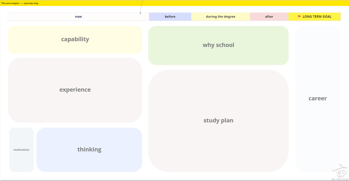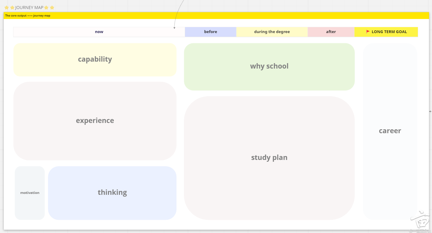 然后再将 JOURNEY MAP 里的东西拆解到文书中。 文书应该是互补的,能拼成一张完整的 MAP。CV 叙述了一个项目怎么做和具体技术和成果,PS 就不需要重复一遍,而是提供更多相关的信息,例如为什么做,做完是怎么打算的。