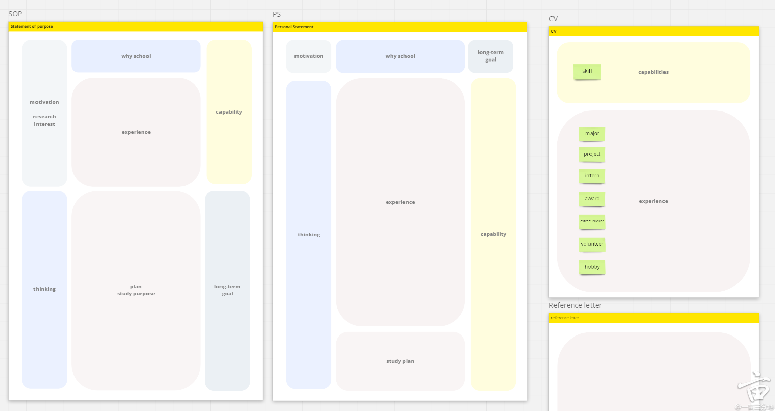 【申请前】 内在动机,对你重要的经历,经历背后的思考,对于专业的理解,专业和学校看中的的能力和特质。 【申请后】 HOW MIGHT WE 处可以填计划的细化:在去读研究生之前,研究生期间,以及毕业后你的打算。 (比如你文书可能想提到你毕设准备做什么之类的,可能还要补修什么课,看看能不能表明你会补充你所欠缺的东西) 规划的地方结合具体项目的内容来,项目的课程安排,师资,co-op。 要显得你非常了解这个项目:比如 xx 学校对面就有一家我的 dream 公司,而且校企有合作,查了下步行只要五分钟。 ———————————————————— 8)根据文书要求进行挑选, 将所有重要的点拆到你的文书里。 并整理框架。 如果对于框架梳理没有很明确,可以先用卡片写作工具将每一个便利贴的点扩写出来。 一边写一边给卡片打上 tag。notion 的 database 和 trello 都非常方便拖动。 拖出一个你觉得还不错的思路。也欢迎和我约时间! 例如 PS 侧重 我是谁:具体经历 + why school + 我的目标; SOP 侧重 我的计划:经历总结 + 我的目标 + 我的计划 + why school; CV 侧重 我的能力:我的经历 + 我的能力(硬); 推荐信侧重 他人背书: 我的经历 + 我个人特质(硬偏软)。