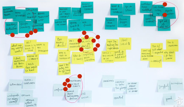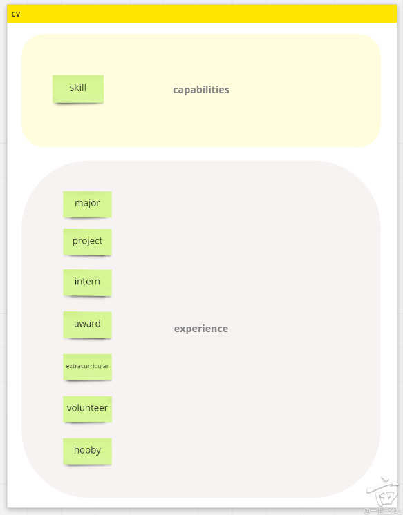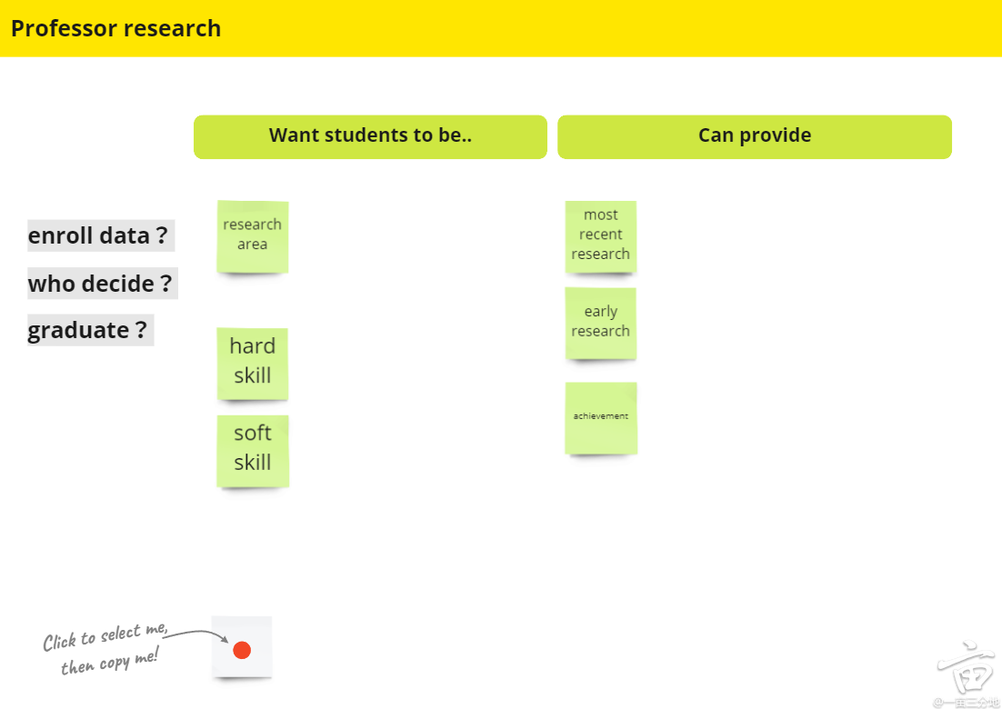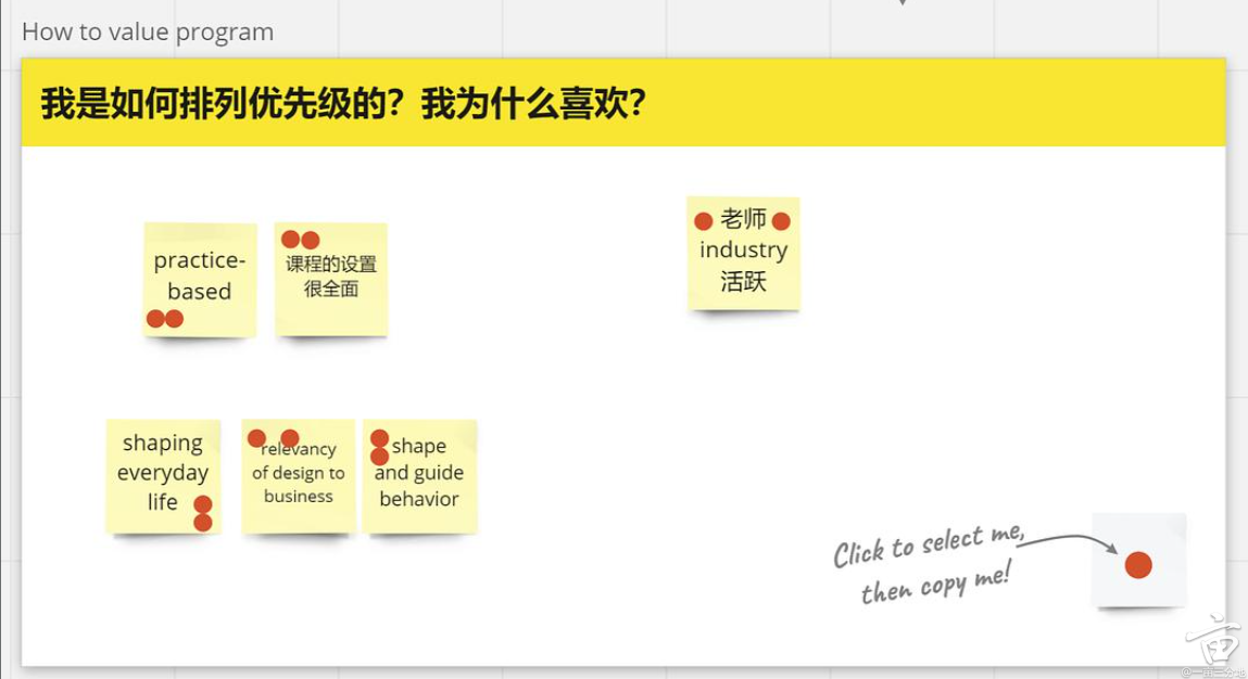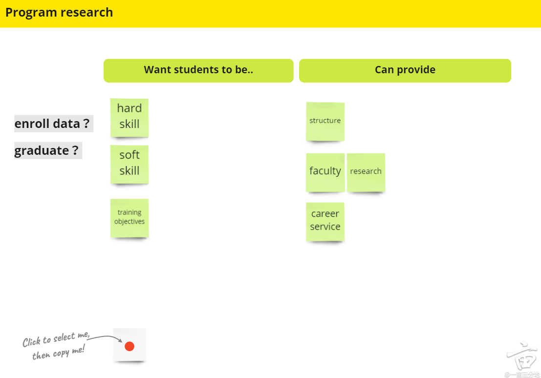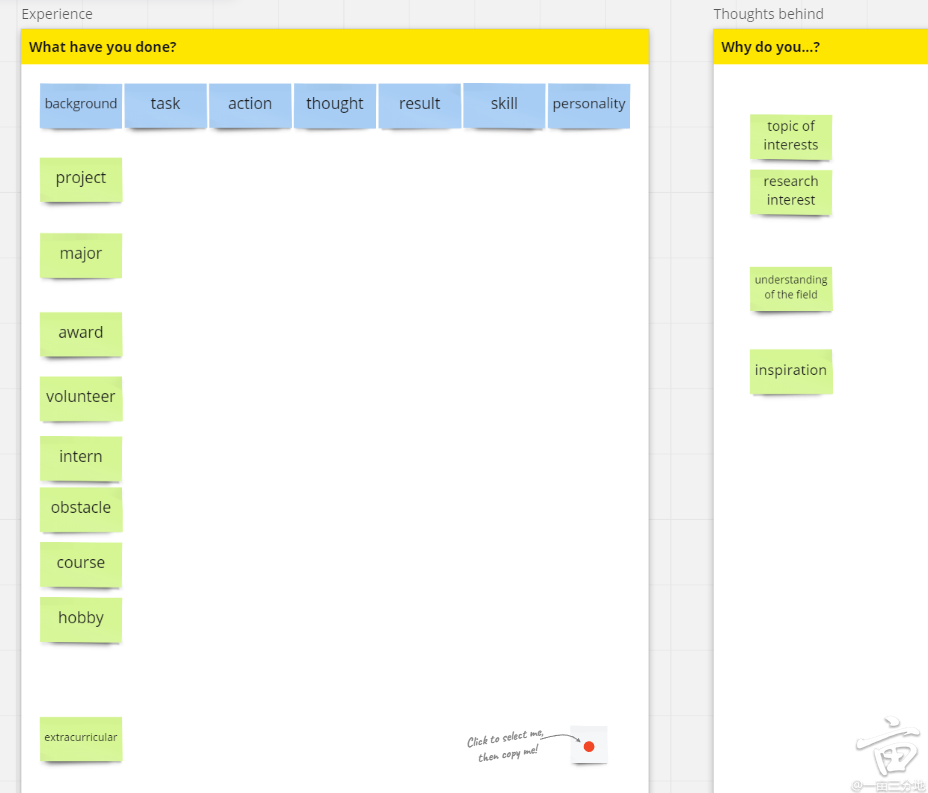 ———————————————————— 完成这个 JOURNEY MAP 的思路! 收集尽可能的多的信息 → 试图给他们投票排序选出最核心的部分 → 再将他们串联起来 → 尽快出一份初稿 → 推动进一步思考和收集信息 → 迭代!!! 1)相比于一般的填表/思维导图,设计方法里面【白板 + 便利贴】的方式是非线性的。 想法数量大于质量,不需要按步骤每一步走,想到就记下来。不需要给 “完美确切” 的回答,之后有优化和挖掘的空间。 能更不受约束地把所有想到的点写下来。比如今天看了什么申请经验,可以把要点记录下来作为自己的计划。突然想到自己的某种特质,写下来作为对自己的认识。采集够了一定的数据之后,就可以对他们进行整理。 2)对于点进行整理,发现有相近的关键词可以靠拢做小的总结。 整理出选出最核心的部分(需要在文书里展现的),可以邀请几个人一起来投!比如:自己投对自己影响最大的经历。找相关专业的学长学姐投最体现专业能力的。别的专业的朋友投最吸引人最有趣的。