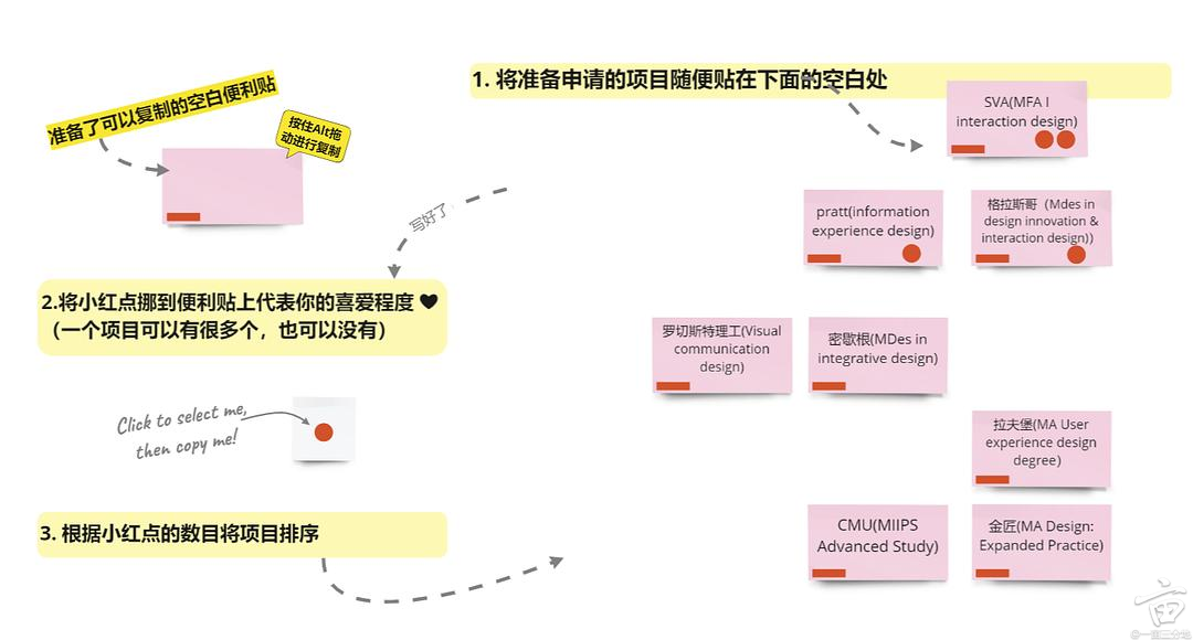 3)把这些最重要最核心的部分拎出来,组成一张 journey map,再拆分到 不同文书里。 过程中可以查漏补缺,看看有没有缺什么点。 希望能从核心的点上找到一些自我叙事!这个展开来又可以说很多~ 我个人觉得可以借着写文书的机会整理一下 “自我叙事” ,自我叙事深刻代表了独一无二的“你是谁”。最近看到一段: 心理学家丹·麦克亚当斯(Dan McAdams)说,人格可以分为三个层次: 第一个层次,是基本特质,也就是我们通常理解的内向外向这个层次; 第二个层次,是应对方式。比如我们的目标、防御机制、信仰,我们在人生某个阶段的生活任务和中心; 第三个层次,也是人格最核心的层次,是人生故事。我们在不停地把过去、现在和未来重新编制成一个前后连贯、生动的个人故事。这是我们把自己和别人区分开来最重要的特质,也是人格最重要的因素。 4)以结构化的形式走下来很快!可以督促继续收集信息和迭代! 快速完成一份初稿用于迭代!!走完这个过程之后,一定会有很多新的想法,申请途中也会收集很多新的信息。可以随时增添,然后加入到 JOURNEY MAP 里来! 5) 多挖掘背后的原因和动机! 多进行苏格拉底式提问,每一个给的回答继续追问“为什么?是这样吗?只要这样就可以了吗?”。 看到书上这个例子很合适: 1. 价值观:我想要能学到很多东西的有意义的工作。 2. 我想成为一名医生。 3. 次一级的点:我需要上医学院。 4. 再次一级的点:我需要在科学课程上取得好成绩。 5. 再再次一级的点:我今晚需要在家学习。 我目前和实践发现,一般大家一上来就会说 第 3 级 “我要去XX学校”,然后就说第 4 级 “大家都好卷我好焦虑”。 往上的层级都需要灵魂拷问一点点总结,直接问“为什么”问不出来,就需要问很多“如果不xxxx,那xxxx可以吗?”,“所以只要 xxx 就可以了吗?”。 所以比较搞笑我最近还问了挺多“你这么想的出发点,是不是坚信自己太菜找不到工作?你的目标就是找工作?什么工作都可以吗?哦所以你的目标就是钱咯?如果 xxxx 最赚钱你干吗?为啥不愿意啊?”之类的… 6)将零散的便利贴都变成文字!卡片写作! 仍然是零散的卡片式的记录,把想到的都记录下来,最后再进行整理! 任何用“卡片写作”的形式的写作软件都 ok!例如 notion 的 database 或者 trello。 每一个零碎的点/做的事记录一张卡片,起一个简短的标题(标题就可以是便利贴上写的关键词)。可以一边写一边给卡片打上 tag。 后续开始写的时候就非常简单!把相关的卡片内容先摆成喜欢的逻辑,然后复制粘贴之前写的整段文字,然后加衔接等等~ ———————————————————— 具体流程! - 白板软件:Miro 和 MURAL 是我常用的。最近看到有小伙伴自己做了自己的版本也超级好!!我的版本链接放在开头了~ - 卡片写作软件:任何卡片式的工具都可以。方便一些可以直接用 notion 的 database 和 trello 记录整段的文字,同样是以零散卡片式的记录,后续的写作只要将零散卡片整理出来就好。标题可以是便利贴上的关键词,然后内容就是关于这个关键词的各种想法。 - 流程的具体顺序其实都无所谓!!都可以回过来修改和补充。 对自己的目标不明确的小伙伴:梳理过去经历 → 从经历中探寻人生理想/长期目标 → 确立下一步是什么 / 短期目标 → 寻找贴合目标院校 非常明确的小伙伴:dream school → 对应的职业/长期目标 → 五年计划 → 梳理目标相关经历 1)Warm Up(自己用的话可以熟悉一下白板操作,我带的话用来了解我们这几次核心解决的问题) 写一些申请时候的考虑,目前做的事情,有的困惑。可以借机做一个时间规划~ 想申请的项目,然后试着给他们按愿望程度排序。