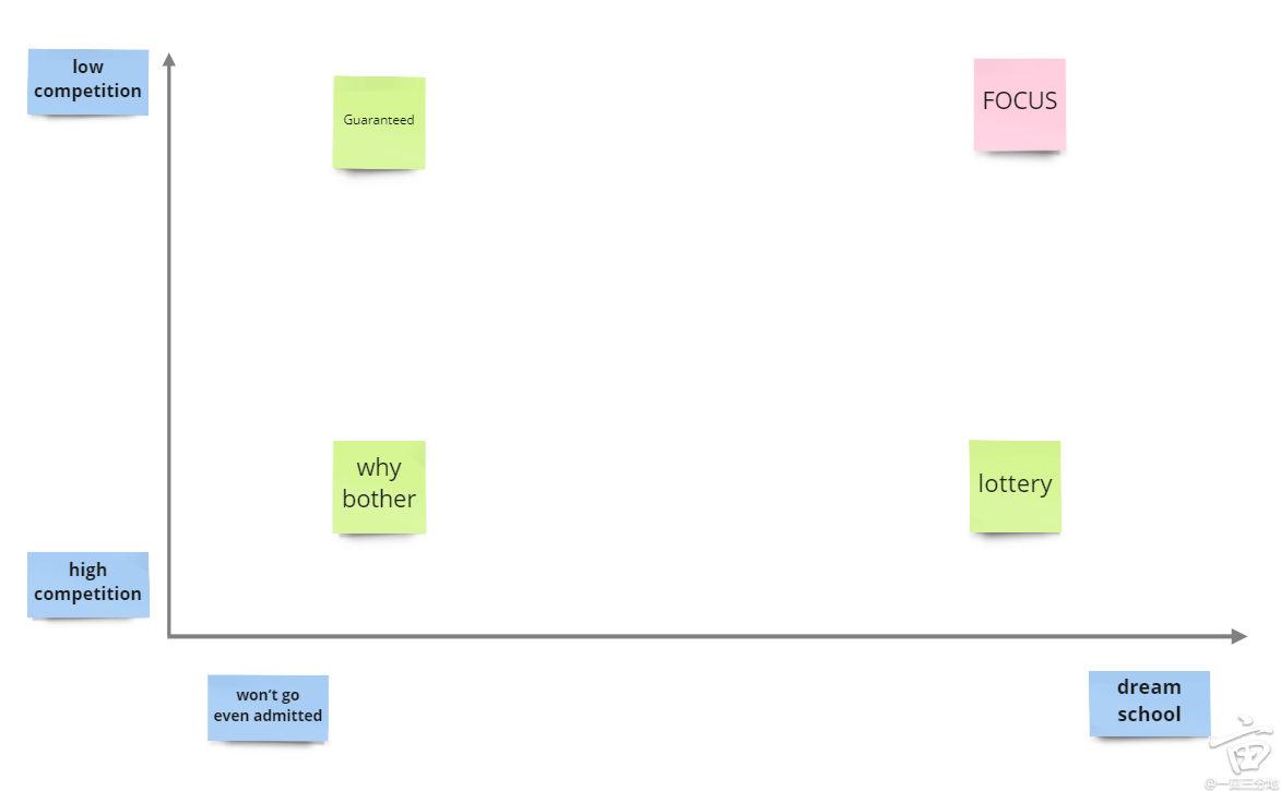 这一步可以回过头有更多信息和想法来再修改,因为实际选校和目标会强相关—— 比如要就业,那可能就是 实践机会 / career service / 地理位置 / networking; 如果想要多试错,那就是跨学科方向 / 同学专业背景不同 / 灵活选课; 如果要留下工作,可以明确国际生情况 / 签证情况 / 足够的时间处理和选择; 如果是润:1+3+润政策; 确定了自己挑项目的 必要条件/锦上添花条件 之后更有助于对于项目的梳理。 什么是必要条件:追问 如果这个学校排名下降 50 我还爱它吗?如果校区搬到了村里我还爱它吗? 选校优先级矩阵!IMPACT VS EFFORT 分为:彩票,主申,保底,申它干嘛? 想申不同专业/不同方向也可以按这个列一下, 右上角 非常想去 + 录取概率大 的是申请重点,付出时间和精力的优先级较高。