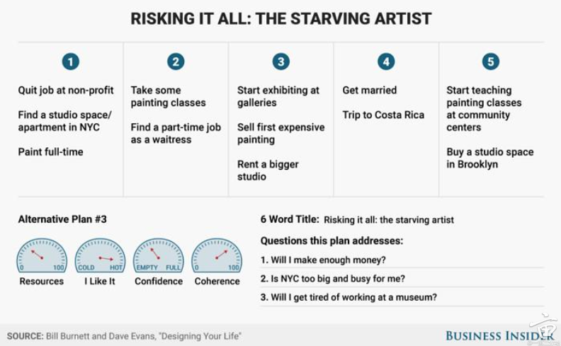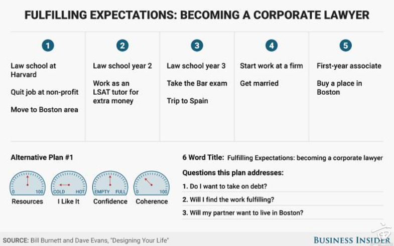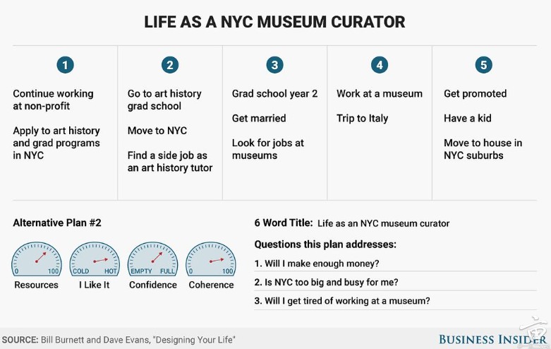 先写一大堆,五花八门的都行。 想想你最想要的是什么? 你的一天会是什么样?你住在哪里?身边有谁? 什么是你理想的生活?什么是你理想的工作? 当然可能你最想要的根本不是出国读书带给你的,那也可以写下来,这也代表了你的某种诉求。(说不定你想清楚了就不申请了那也很好!! 这一步可能很多小伙伴有点卡! 可以试着考虑:如果不用考虑任何生存,你的五年后的理想是什么? 如果某个计划不得不放弃,你的计划是什么?多想几种方案。 可以考虑用 The Odyssey Plan 的方法。 下面是某个人的 Odyssey Plan,未来的三条路径:读 law School,读艺术史去博物馆,或者完全遵从内心当一个艺术家。