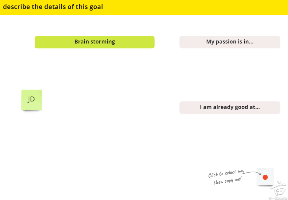 然后从上面的目标中挑那个和你 dream program 最相关的! (可以回过头再思考一下你的目标专业和院校!如果你实际的人生理想和 dream program 相悖,那就需要思考一下,换掉或者细化哪一个了。 对于“我完全不知道自己想要什么”的小伙伴: - 可以先完成自己的经历部分 - 从已经做的事情上找灵感 - 可以从以下几个方向想:自己擅长做什么?喜欢做什么?有用什么赚到过钱?
