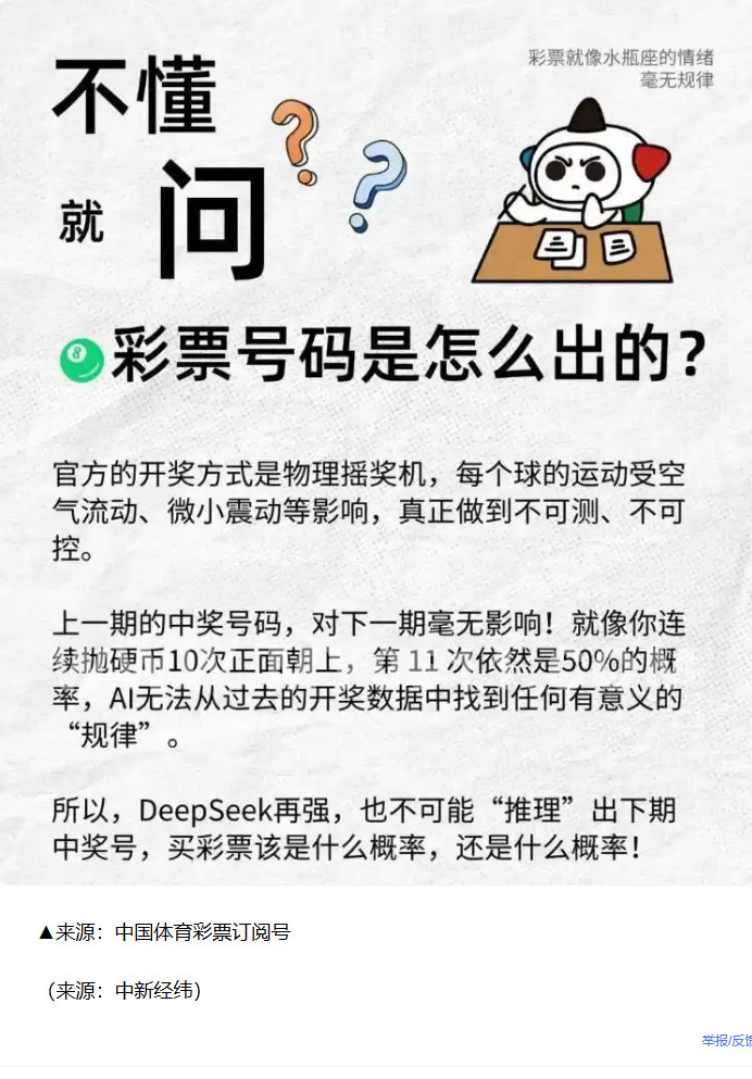 彩票号码是怎么选出的? 中国体彩表示,官方的开奖方式是物理摇奖机,每个球的运动受空气流动、微小震动等影响,真正做到不可测、不可控。 上一期的中奖号码,对下一期毫无影响。就像连续抛硬币10次正面朝上,第11次依然是50%的概率,AI无法从过去的开奖数据中找到任何有意义的“规律”。 所以,DeepSeek再强,也不可能“推理”出下期中奖号,买彩票该是什么概率,还是什么概率。