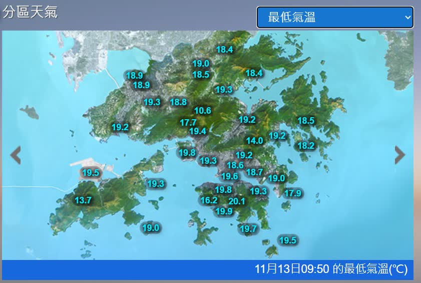 乾燥東北季候正影響華南。同時,一道雲帶覆蓋廣東沿岸。本港今(13日)早天氣稍涼,氣溫普遍下降至20度左右,打鼓嶺及大美督只得18.4度。天文台指,下星期二及星期三(18及19日)天氣顯著轉涼,下星期二氣溫會降至16,19日更進一步下跌至只有15度,風勢頗大。 本港地區今日(13日)天氣預測大...