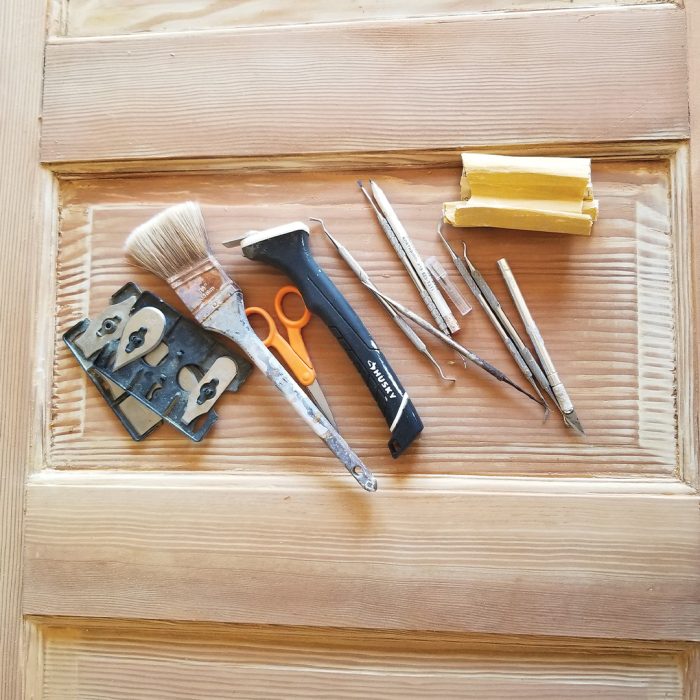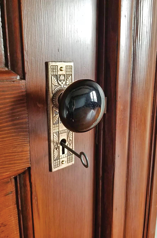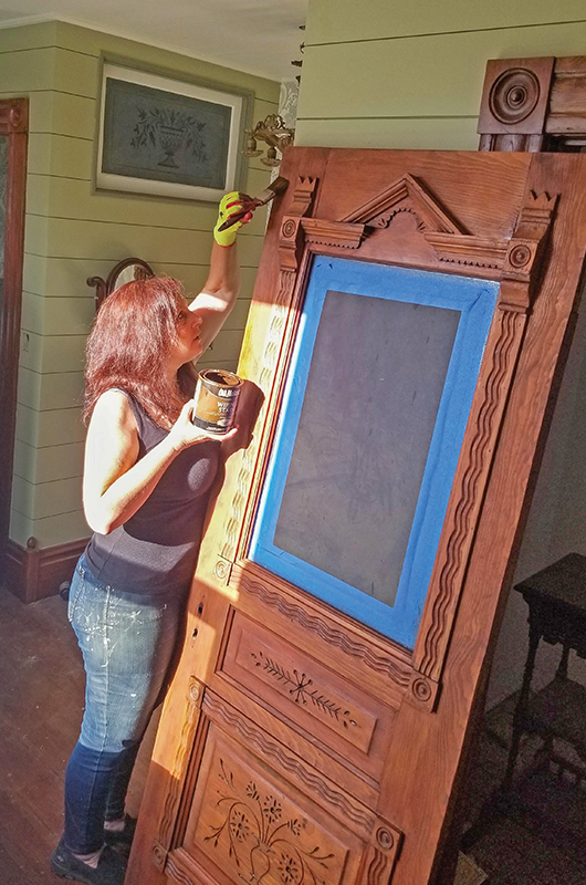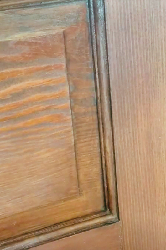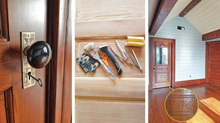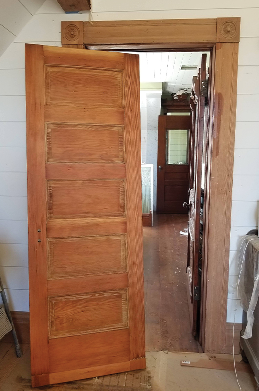 A door of Douglas fir does not take stain very well, especially after it’s been subjected to six to eight coats of paint over a century or so. I’d already spent months (years, actually) hand-stripping millwork and the existing five-panel doors in my Queen Anne when I developed a passion for Eastlake doors. I began to collect them, with an eye toward placing these beauties in key locations that lacked doors, especially in the primary suite upstairs. I learned the hard way to remove every bit of paint and shellac from a door before moving to the next step. Old shellac and stain, hardened into crevices, will show if it isn’t removed.