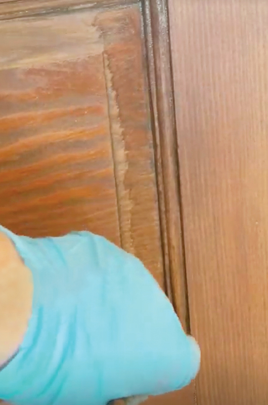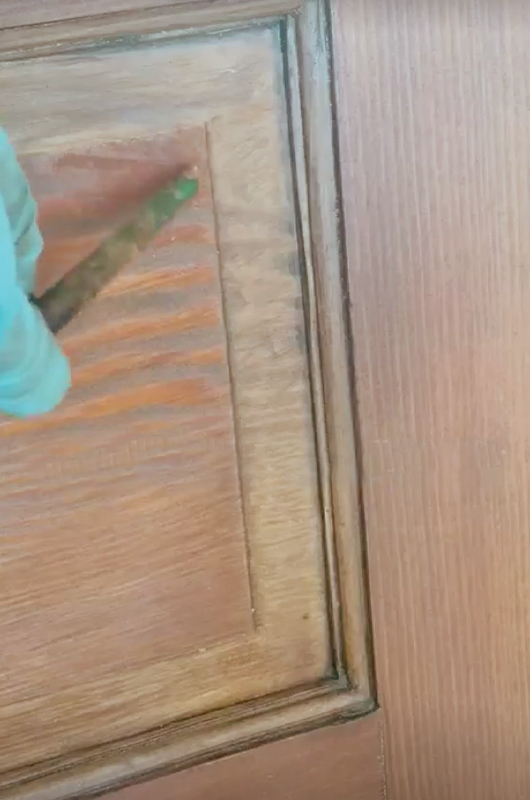 It’s especially tedious to pick out, but I use a contour scraper with sharp, pointed head to remove it. Once every scrap of residue is gone, I apply a pre-stain conditioner that seals the wood and helps a stubborn wood like Doug fir accept stain without unevenness or blotching. Even with the conditioner, some doors will show a lot of unevenness. Darkening a Light AreaIn areas that are too light or lack the reddish hue of the rest of the door, Gina Bellous dry-brushed a transparent layer of oak-tinted gel stain— just enough to lend those areas some color. Use a high-quality, soft, natural-bristle or synthetic brush to apply, and keep it loaded with shellac. If it is set down for even a minute, it will harden.