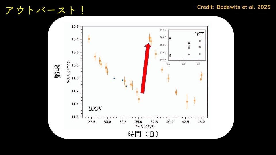 この図は、彗星の明るさの時間変化を示した光度曲線です。横軸が時間で、縦軸が明るさ、単位は等級です。小型の望遠鏡を使えば肉眼でも見れるくらいの明るさがありました。光度曲線を確認すると、近日点を通過した後の11月2日から4日にかけて、彗星の明るさが急激に上昇する、アウトバーストを起こしていることが分かります。