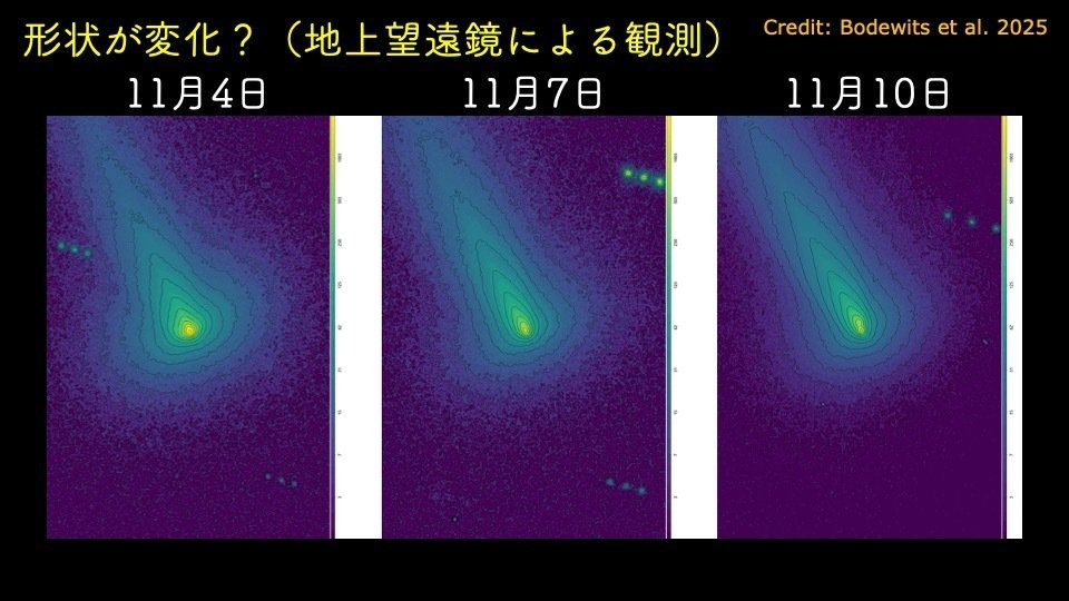 中間赤外線の観測では、波長10マイクロメートルと18マイクロメートルの2枚のフィルターを用いて画像が取得されています。これらの二つの画像を重ね合わせて、適当に色をつけるとこのようになります。この波長帯では、太陽光を浴びて温まった塵が放つ熱的な光を直接捉えることに適しています。そのため、塵の温度分布や、可視光では見えにくい大きな岩石質の破片の存在を明らかにすることができます。 太陽系誕生の謎に迫る「3次元分光」の可能性このような近赤外線で捉えた『太陽光の反射』と、中間赤外線で捉えた『塵自体が放つ熱の放射』の、2つのデータを組み合わせることで、彗星の内部から放出された物質がどのような性質を持っているのか、その全貌を統合的に理解できるようになります。 ただし、ジェイムズウェッブ宇宙望遠鏡の強みは、こうした画像による形状の観測だけではありません。今回の緊急観測の最大の狙いは、画像の一点一点から詳細な成分データを抽出する分光観測にあります。 この観測プログラムでは、ジェイムズウェッブ宇宙望遠鏡に搭載されたNIRSpecの3次元分光機能を用いた観測も予定されています。通常の観測では、天体を写真として撮るか、あるいは特定の点や線の成分を詳しく調べるかのどちらかでした。しかし、この3次元分光機能を使うと、カメラの視野に映るすべての場所のスペクトルを同時に取得することができます。 そのため、彗星のように広がった天体であっても、どこにどのような物質が存在するのか示す化学組成の地図を精密に作成することが可能になります。とくに、今回の彗星のように核が複数の破片に分かれた場合、それぞれの断片ごとに、水の氷と二酸化炭素の比率に違いがあるのか? そして、破片ごとに成分が異なっていれば、それは46億年前にこの彗星が形作られた際、場所によって異なる材料が取り込まれていたという中身のムラ、つまり不均一性を示す重要な証拠となります。とりわけ、現在の彗星は、太陽の熱によって表面が剥がれ、太陽系が誕生した当時のままの成分がむき出しになった状態と考えられます。 この貴重な瞬間をジェイムズウェッブ宇宙望遠鏡で立体的に分析することにより、彗星という凍りついたタイムカプセルを正しく読み解き、太陽系がどのようにして作られたのかという、大きな謎が解き明かされると期待されています。 今後の進展が楽しみですね! Credit: NASA, ESA, CSA, STScI Bodewits et al. 2025 https://arxiv.org/abs/2511.19707v1 (责任编辑:) |