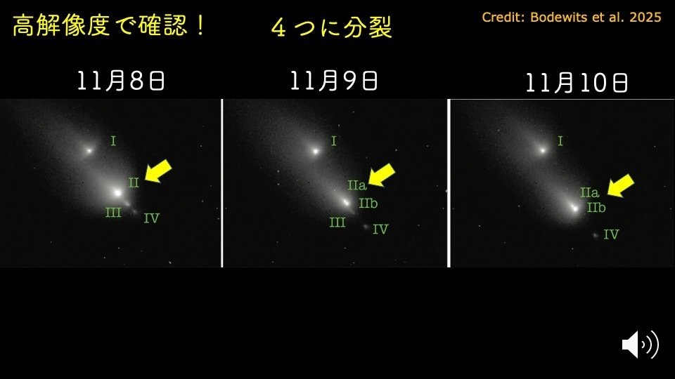 このような現象では、彗星の構造に変化が起こったことも考えられます。実際に、地上の望遠鏡を用いた観測からは、この増光に伴って彗星の核を取り巻くコマの形が、短時間で変貌している様子がこのように捉えられています。左が、11月4日、真んが11月7日、右が11月10日に取得された画像です。あまりはっきりしませんが、時間と共に全体的な形が変化している様子がわかります。 ハッブル宇宙望遠鏡による緊急観測と核の分裂このような変化をより鮮明に捉えるために、ハッブル宇宙望遠鏡を用いた高解像度の緊急観測が、11月8日から10日に、このように行われています。