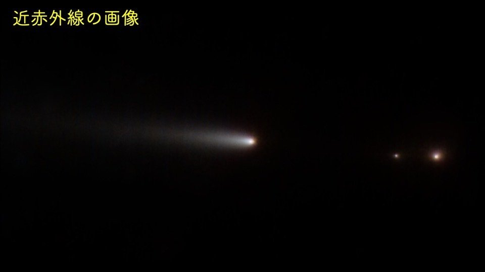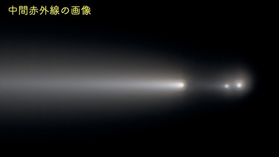 彗星の核が鮮明に見えるようになり、核が一つではなく、少なくとも4つの大きな破片に分裂した姿が描き出されています。特に、最初の観測で明るい主要な成分として見えていたものが、わずか数日後の次の観測ではさらに細かく断片化していくという、逐次的な分裂の過程が捉えられています。 さらに、明るさの時間変化と比べると、核が物理的に割れた直後にすぐに明るくなるのではなく、1日から3日ほども遅れて、明るくなることが明らかになりました。これは、分裂によって新たに露出した彗星内部の新鮮な氷や揮発性の物質が、太陽の熱を受けて十分に昇華し、ガスや塵を放出し始めるまでに物理的なタイムラグがあることを示唆しています。 つまり、太陽系の最果ての地から、数億キロの旅を経てきた彗星の内部物質が、初めて太陽の光に触れて活動を再開するまでの熱の伝わり方という、物理学的なプロセスを捉えることに成功しています。 ジェイムズ・ウェッブ宇宙望遠鏡による多波長観測このように、ハッブル宇宙望遠鏡によって核の分裂が確認されたことから、この貴重な瞬間を逃さないために、ジェイムズ・ウェッブ宇宙望遠鏡による緊急観測も実施されています。 特に、エウレカ・サイエンティフィック社のBryce Bolin博士を中心とする研究チームは、彗星が完全に霧散してしまう前に、短期間で3回の観測を行うという極めて濃密な計画を立案しました。この提案は、無事に採択され、その一部は早速実行されています。 このような緊急観測のデータは、立案したチームが占有するのではなく、観測後すぐに全世界の志ある研究者や市民に公開されます。そのため、世界中の誰もが最先端の宇宙の姿に触れることができます。 実際に、2025年12月29日に、近赤外線カメラ、ニアカムと、中間赤外線カメラMIRIで取得された画像が公開されているので触ってみましょう。 まずは、近赤外線カメラ、二アカムで取得されたデータを、三色合成するとこのようになります。