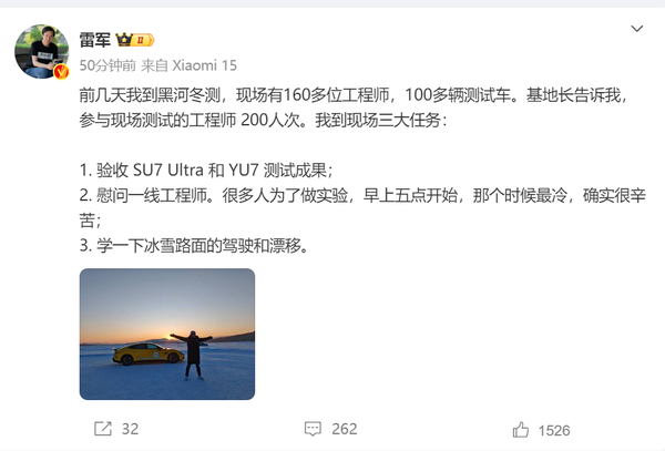 目前,雷军和卢伟冰正在黑河参与小米新车的冬季测试。雷军今天发文表示,他前几天到黑河冬测现场,看到有160多位工程师和100多辆测试车,实际参与测试的工程师达到200人次。他此行的主要任务是验收SU7 Ultra和YU7的测试成果;慰问一线工程师,很多人为了做实验,早上五点就开始工作,非常辛苦;学一下冰雪路面的驾驶和漂移。 (责任编辑:) |