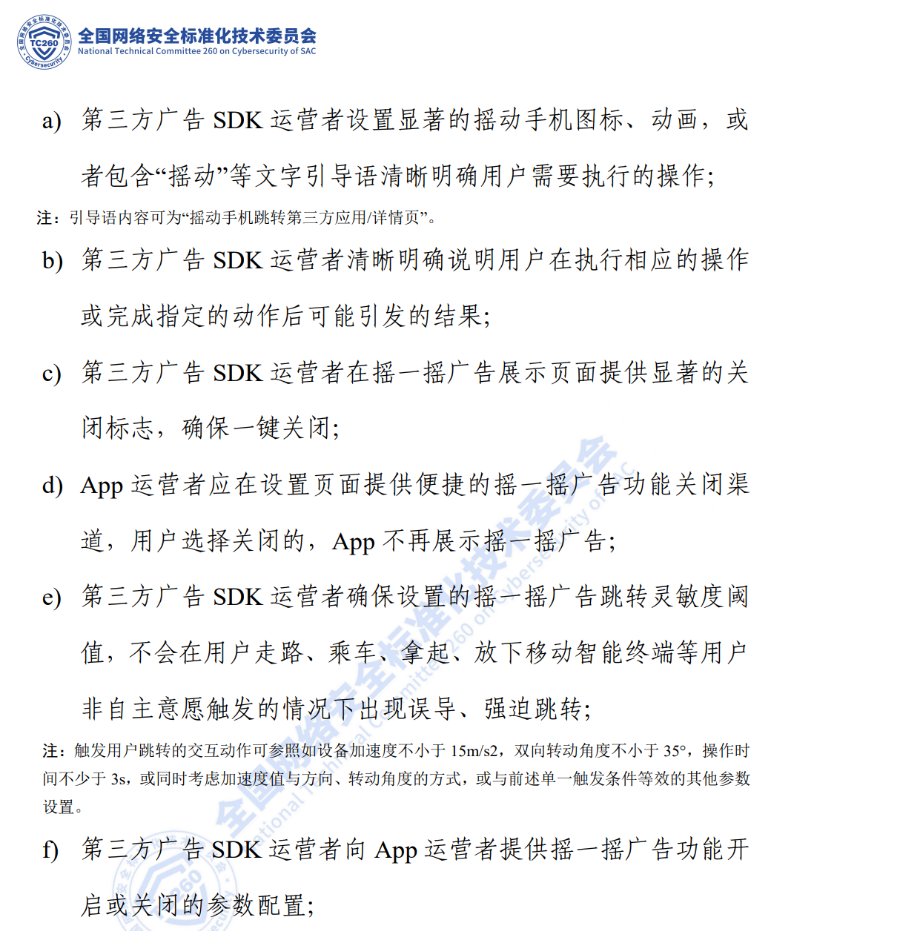 记者丨肖潇 编辑丨王俊 被消费者吐槽多年的“摇一摇”跳转广告,迎来更明确的行业规范。 7月22日,全国网络安全标准化技术委员会正式发布《网络安全标准实践指南——摇一摇广告触发行为安全要求》(下称《实践指南》),旨在确保用户自主选择“摇一摇”广告触发,避免误导和强迫跳转。 本次《实践指南》明确了“透明性、自主性、个人信息保护”三项基本原则,并细化了App运营者与第三方广告SDK的分工。 例如,第三方广告SDK不得设定过于敏感的触发参数,App则需提供醒目的“一键关闭”通道。 虽然作为技术性文件,《实践指南》不具强制效力,但可以被作为监管、执法和评估的重要参考。 明确广告SDK与手机App各自责任 关于“摇一摇”广告的消费者投诉 【下载黑猫投诉客户端】已持续多年。早在2024年1月,中消协发布消费维权舆情热点,其中之一即为“摇一摇”广告的泛滥现象。 中消协指出,在2023年“双11”期间,“摇一摇”跳转广告泛滥之势引发诸多热议。许多用户反映走路的时候打开App都能跳转到第三方软件,“甚至专门打开都没跳转的快”“想关也关不了”。 根据《实践指南》的解释,“摇一摇广告”是一种手机广告的触发形式,通常出现在 App 开屏首页。其通过调用手机中的加速度、重力、陀螺仪等一种或多种传感器实现,当用户的晃动动作触发设定阈值时,便自动跳转至广告页面。 过去几年,监管部门亦曾多次关注“摇一摇”广告的跳转乱象。 比如,2022年,电信终端产业协会在工信部指导下发布了《App用户权益保障测评规范》,要求App信息窗口不能欺骗性跳转,并具体设定了“摇一摇”广告的触发门槛:加速度不小于15m/s2,转动角度不小于 35°,操作时间不少于 3s。 2023年2月,工信部发布《关于进一步提升移动互联网应用服务能力的通知》,重申“不得利用高灵敏度‘摇一摇’等易造成误触发的方式诱导用户操作”。 尽管规范频出,“摇一摇”广告乱象仍难根治。21记者此前获悉,有第三方聚合广告SDK平台“指导”App开发者,根据监管检测形式,动态调整参数,躲避监管。最近这套灰色策略引起监管关注,约谈了第三方广告SDK。 多位业内技术人士告诉21记者,其实“摇一摇”广告的展示,大部分由第三方广告SDK控制。其是一种嵌入App里的开发工具包,也是快速接入广告资源的渠道。 而21记者注意到,相比征求意见稿,本次正式发布的《实践指南》在责任划分上更加清晰,明确区分了第三方广告SDK、App运营者的责任。 具体来说,《实践指南》要求第三方广告SDK必须设置清晰的“摇动”图标和指引,并确保广告的触发灵敏度不会因用户非自主意图的操作(如行走、乘车、拿起或放下设备)而产生误触跳转,触发阈值与此前规定一致。 与此同时,App运营者在接入第三方广告前,也要对相关参数进行检测,防止未经用户同意的参数更新。 App需设置一键关闭“摇一摇”广告渠道 从原则层面,《实践指南》还提出了对App运营者和第三方广告SDK的三项基本要求:透明性、自主性和个人信息保护。 其中,“透明性”意味着必须向用户披露真实、有效、完整的信息;“自主性”要求设置便捷的广告功能关闭渠道和合理的触发阈值,保障用户自主选择是否触发广告跳转;而“个人信息保护”旨在防止信息泄露和信息滥用。 针对 App 运营者,《实践指南》也提出了多项安全要求。比如,App应在设置页面提供便捷的“摇一摇”广告功能关闭渠道,用户选择关闭的,App 不再展示“摇一摇”广告。 此前,微博、豆瓣、哔哩哔哩、网易云音乐、虎扑、喜马拉雅、百度、番茄小说等应用均曾被用户点名投诉。在部分地方消协的介入下,已经有部分平台提供永久关闭“摇一摇”广告的选项,通常位于“设置”-“隐私权限”中。 截至7月23日,21记者再次测试以上8款App,其中哔哩哔哩、网易云音乐、虎扑、喜马拉雅、番茄小说4款App已能在后台设置了关闭“摇一摇广告”的选项,其余App以及市面上大多数应用暂未提供类似选项。 值得注意的是,《实践指南》作为技术性规范文件,并不具备强制力,但可作为行业监管、行政执法以及后续评估的重要依据。 (从左至右分别为:哔哩哔哩、番茄小说、网易云音乐的“摇一摇”广告关闭通道)