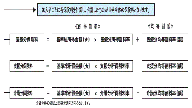 ★基準総所得金額の詳細について ◎保険料率の決め方について 介護分保険料について (1)40歳から64歳(介護保険第2号被保険者)の方は、国民健康保険料の中で介護分保険料を計算します。 3.保険料額の決定 保険料は世帯単位で決定します。 4.保険料額の変更 保険料額を決定した後に、次の1~9の理由により保険料額を再算定した場合は、「国民健康保険料額通知書」によりお知らせします。 国民健康保険へ新たに加入した、又はやめた場合 保険料算定のための被保険者数が増えた、又は減った場合 保険料算定のための被保険者の所得状況等に変更があった場合 被保険者均等割額の減額割合を変更した場合 介護保険の被保険者となった(40歳になった)場合 後期高齢者医療制度の被保険者となった(原則75歳になった)場合 被保険者証番号(保険証の番号)が変わった場合 納付方法の変更等により普通徴収の保険料額が変更になった場合 納付方法が特別徴収又は普通徴収に変更となった場合 ※世帯の中に40歳の誕生日を迎える被保険者がいる場合は、医療分及び支援分のほかに介護分の負担が生じるため、40歳の誕生日を過ぎてから保険料額を再算定し、「国民健康保険料額通知書」によりお知らせします。 再算定の結果、保険料額が増えた場合 これまでの納期の保険料額は変更しないで、これから到来する納期以降の保険料額を均等に増額します。